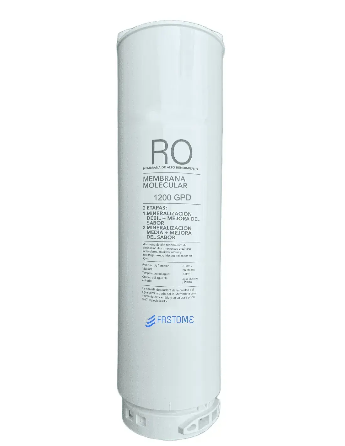 La membrana encapsulada osmosis 1200 GPD Fastome proporciona un filtrado profesional con tecnología de doble etapa: mineralización débil y media. Ideal para hogares con alto consumo o entornos empresariales que requieren agua pura en grandes volúmenes.