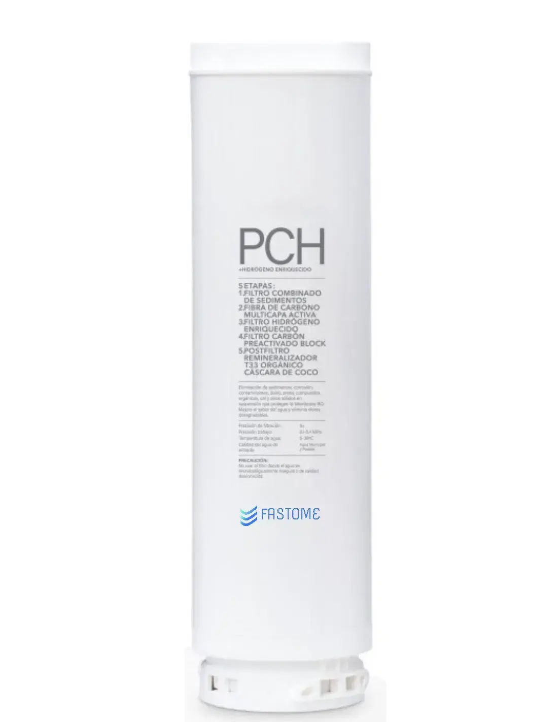 Cartucho para filtros de agua PCH Fastome – eficaz en eliminación de sedimentos y aporte de hidrógeno molecular. Repuesto ideal para sistemas Fastome que buscan agua pura, antioxidante y saludable. Incorpora además postfiltro de cáscara de coco para mejorar sabor y pH.
