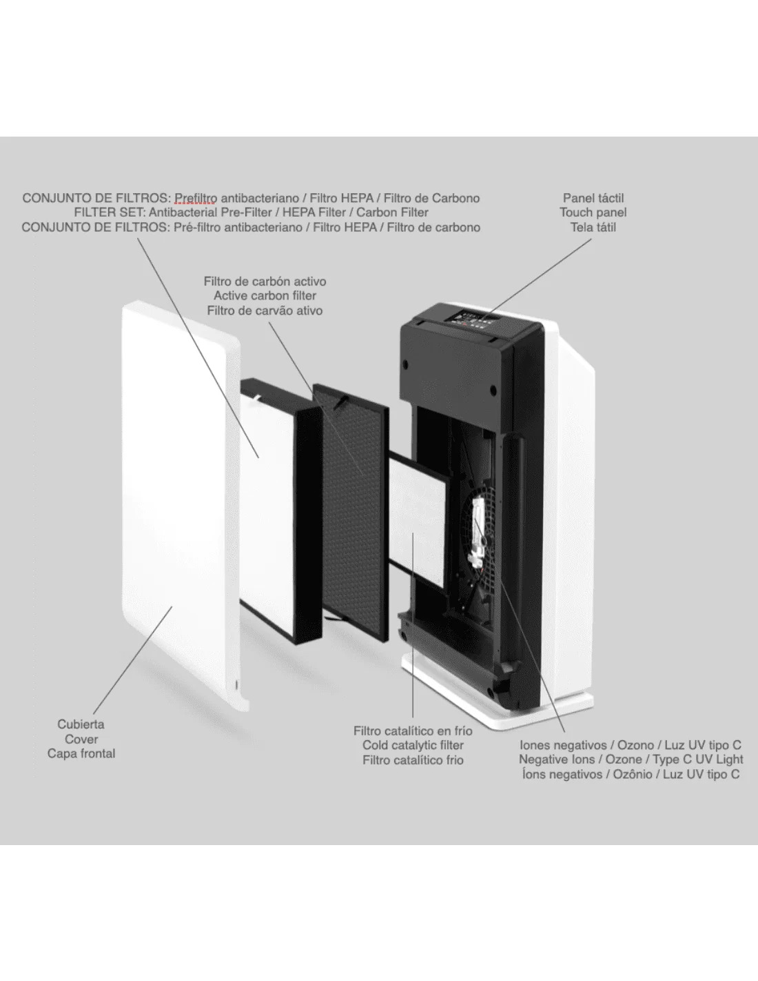 - 8 Etapas de Filtrado: Incluye un prefiltro antibacteriano, filtro HEPA 13, filtro HEGA de carbono, filtro de carbón activo, y catalizador frío, junto con una lámpara UV-C para eliminar virus y bacterias con un 99,99% de eficacia.
