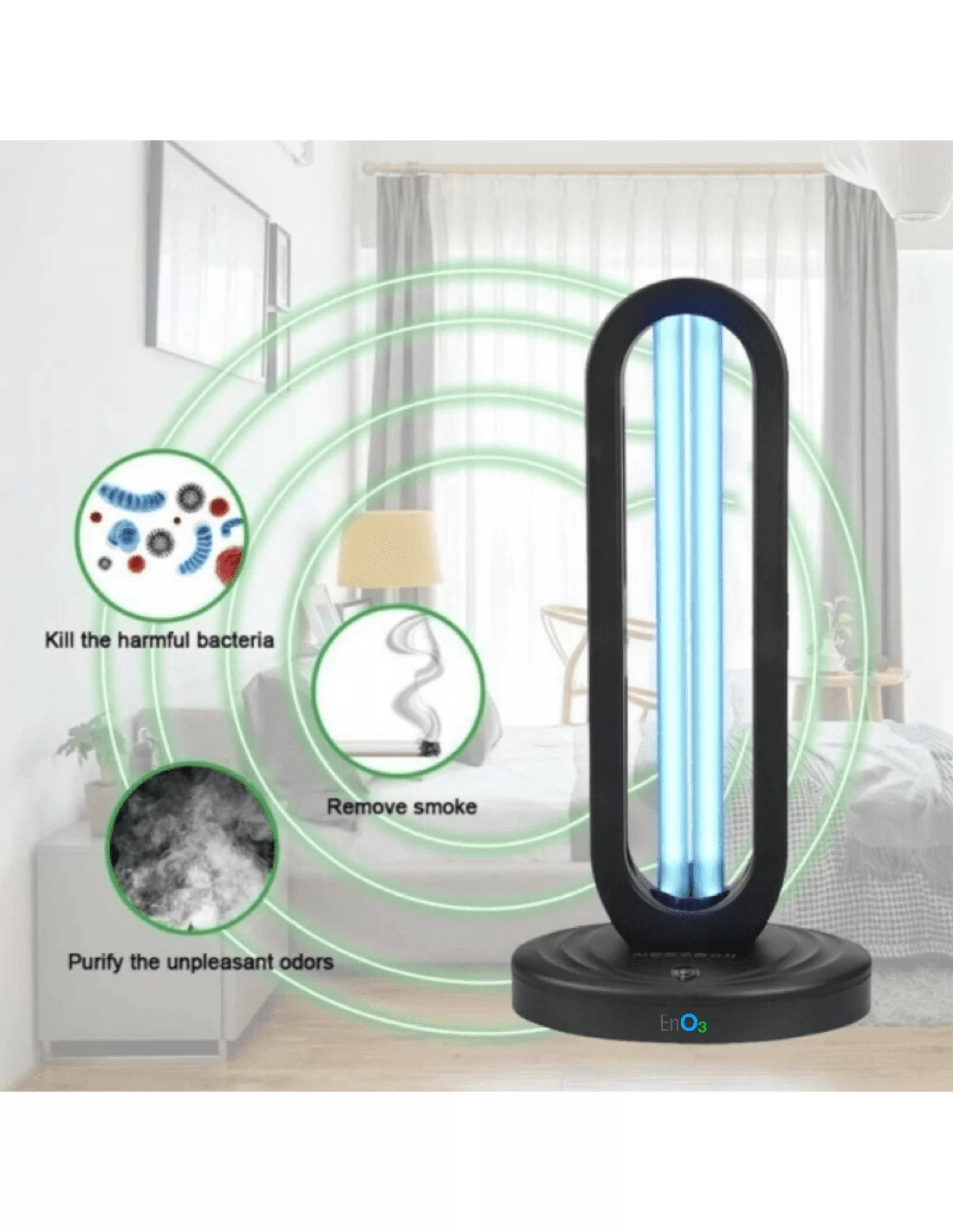 Lámpara de Ozono UV-C EnO3 - La solución avanzada para una desinfección completa del aire y superficies. Equipado con tecnología UV-C y emisión de ozono de 200 mg/h, este desinfectante elimina virus, bacterias y otros patógenos de manera eficiente. Ideal para espacios comerciales, oficinas, y entornos domésticos, la lámpara incluye control remoto, temporizador programable y avisador acústico para un uso cómodo y seguro.