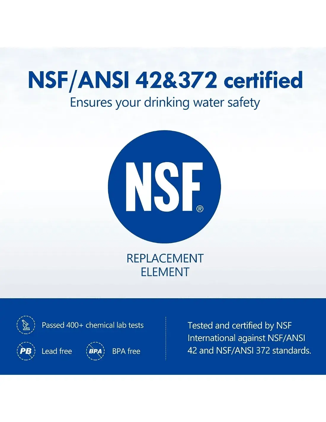 NSF/ANSI 42 and 372 certification for FASTOME replacement cartridge – Lead-free and BPA-free, safe for drinking water