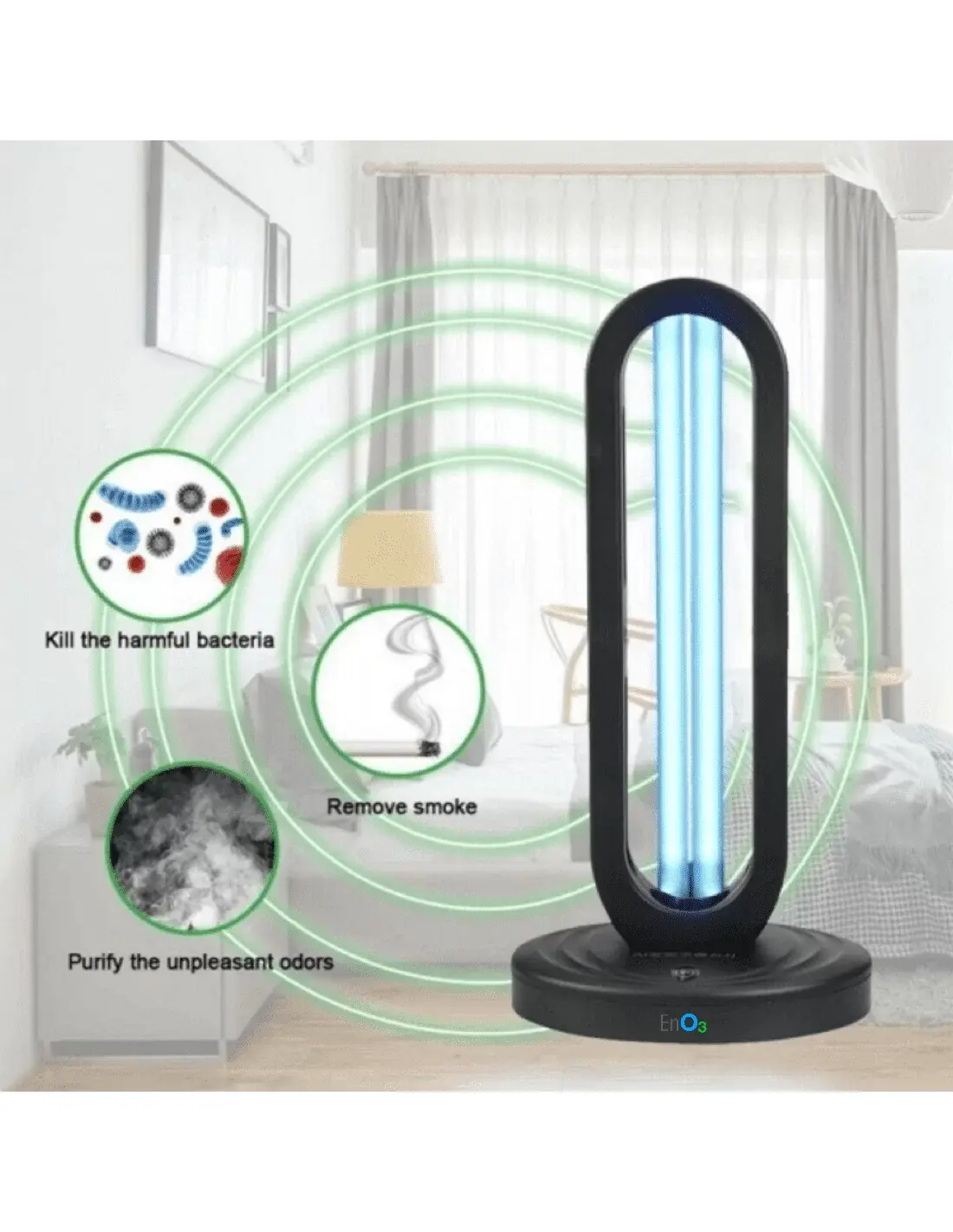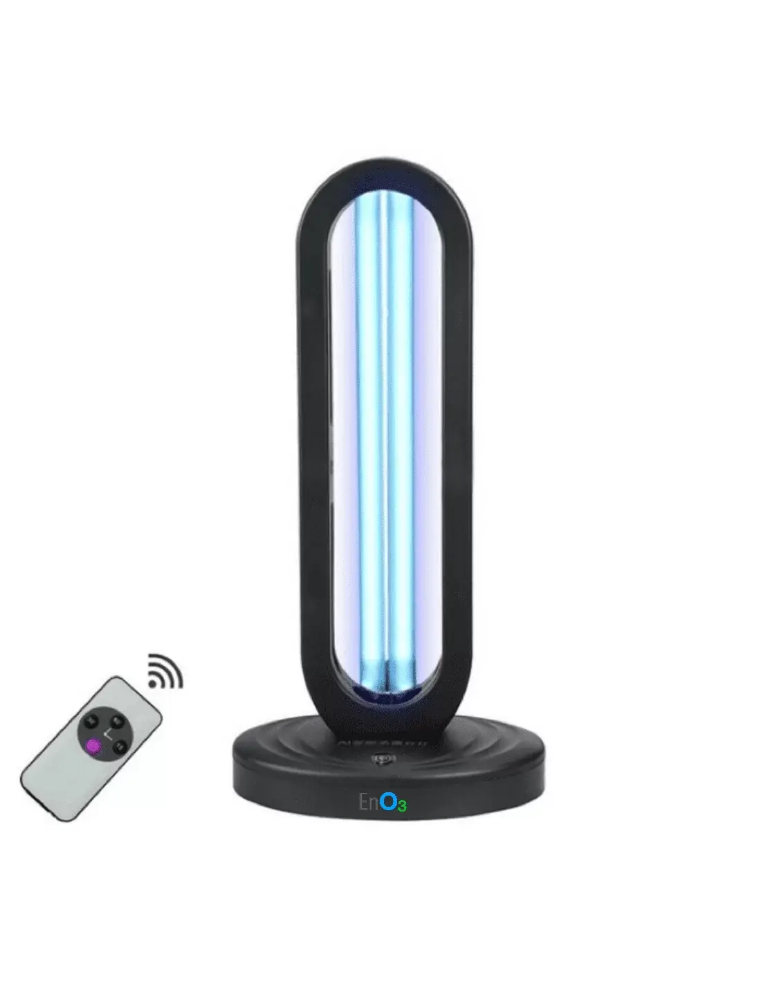 EnO3 UV-C Ozone Lamp - The advanced solution for complete air and surface disinfection. Equipped with UV-C technology and a 200 mg/h ozone emission, this disinfectant efficiently eliminates viruses, bacteria, and other pathogens. Ideal for commercial spaces, offices, and homes, the lamp includes a remote control, programmable timer, and an acoustic alert for convenient and safe use.