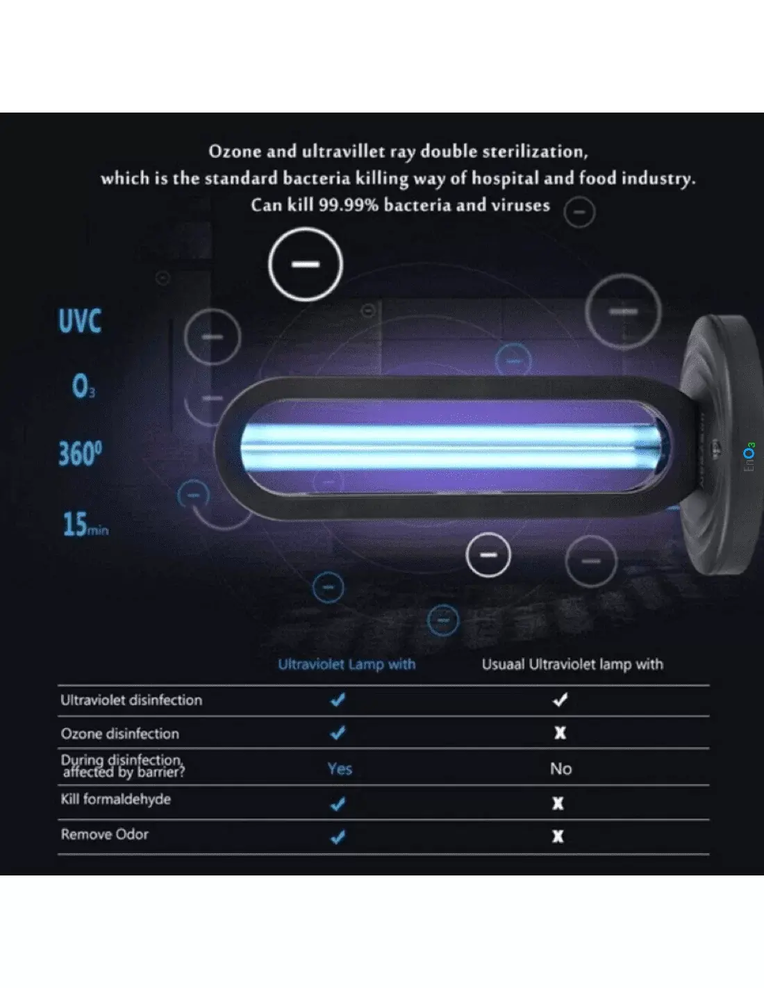 Lâmpada de Ozônio UV-C EnO3 - Solução avançada para desinfecção completa de ar e superfícies. Equipado com tecnologia UV-C e emissão de ozônio de 200 mg/h. Ideal para espaços comerciais, escritórios e residências. Inclui controle remoto, temporizador programável e alerta sonoro para uso seguro.