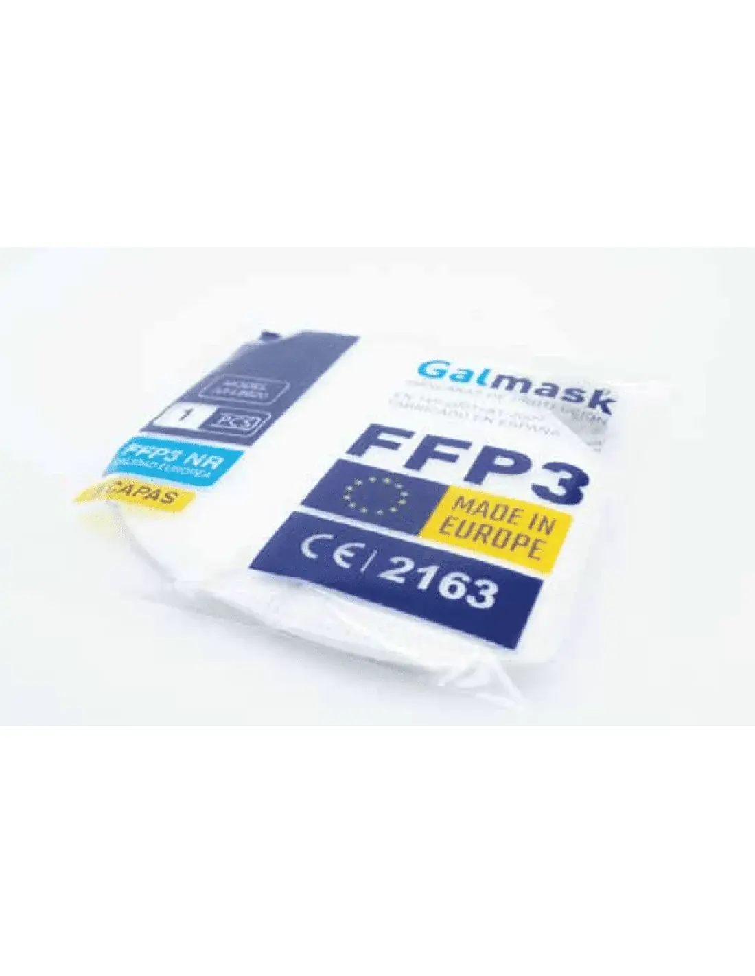 Máscara FFP3 Galmask branca com 99% de filtragem. Oferece alta proteção em ambientes de alto risco, com um ajuste confortável e seguro. Fabricada na Galiza, Espanha.